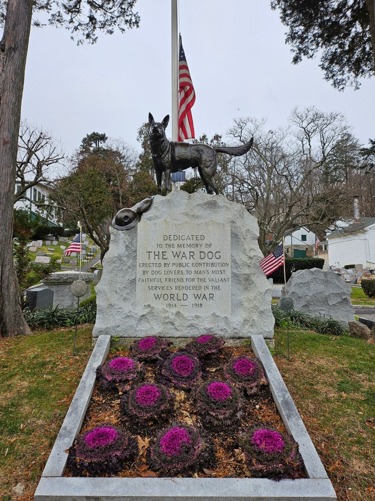 Hartsdale’s pet cemetery is not the cemetery it’s really known for: that’s Ferncliff Cemetery, about three miles on, and the resting site of many celebrities, including James Baldwin, Judy Garland, and Malcolm X. But the pet cemetery is perhaps a deeper testament to our relationship with life and loss. The War Dog is crammed in alongside thousands of memorial plaques and stones, all celebrating pets who were deeply loved. “Dot. October 28, 1916 – July 15, 1929. She lived to love.” “Dobie. 1981 – 1996. We love you.” “Silver Prince. Our beloved Persian cat. 1907 – 1923.” Some are marked with crosses or stars of David, like human graves. Perhaps it is not so surprising that the sentiments across the cemetery are so uniform across time – we have after all been burying pets at least since the Egyptians mummified their cats, a practice which we all thought Ozma would have approved of. Yet to see so much love and grief packed in such a tiny space was oddly moving.