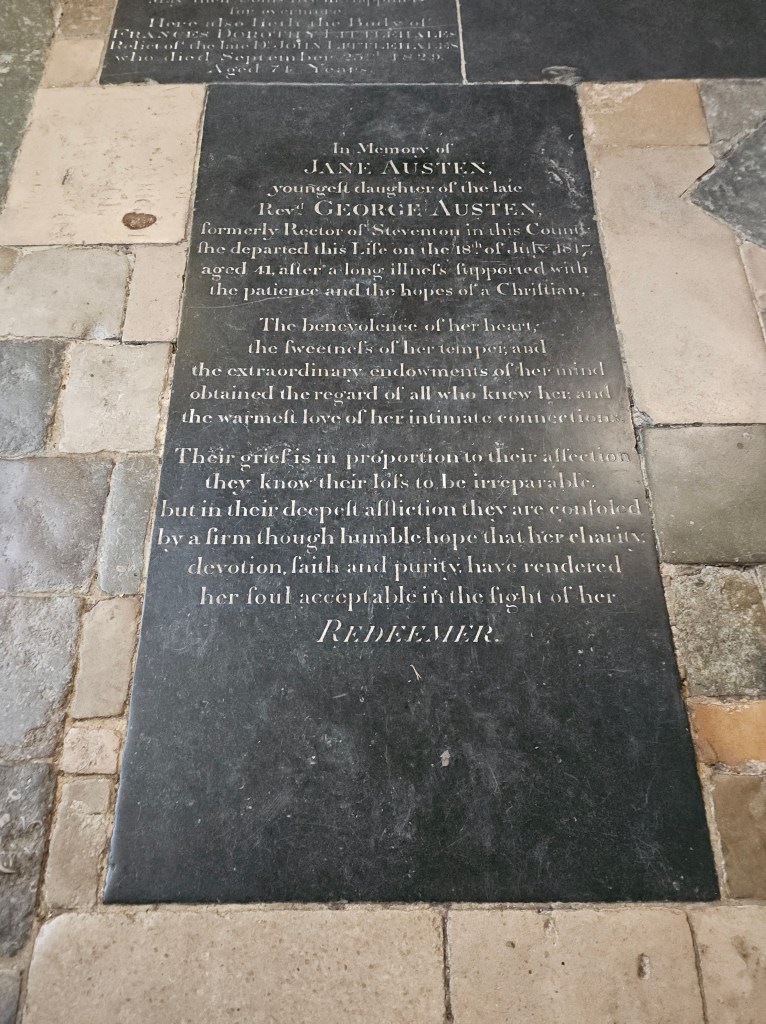 Austen herself is buried in a grave that makes no mention at all of her bestselling novels, a reminder of what was important about being a woman in the early 1800s. As she had no children, she is remembered primarily as someone else’s daughter and as a good Christian soul. Later her fans came together to dedicate a stained-glass window in her memory, but it is supposed to call to mind the Christian side of many of her characters, and if you, like me, associate the “Christian” aspect of Pride and Prejudice mainly with the hopeless Mr. Collins, you will begin to see why it feels a little lacking. There are, however, flowers kept fresh in the nave near her grave, along with a journal, which is packed full of missives beginning Dear Jane from Austen’s fans around the world. Of all the tributes I saw in Winchester and in Chawton, this seemed by far the most fitting.