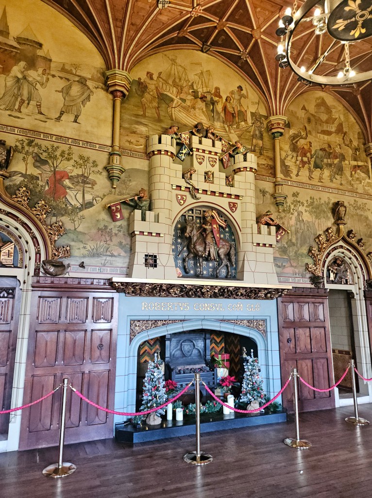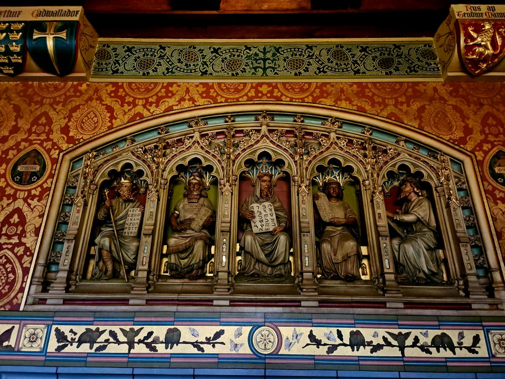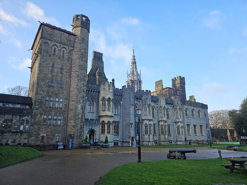 The Sunday before Christmas is never a good time to visit a museum, so we stuck to the outdoor spaces in and around the city, which are reasonably few and can be managed in a day. Cardiff Castle, which began as a Roman Fort and has been continually modified so that now it mostly looks like what its nineteenth and twentieth century occupants thought a medieval castle should look like, is in the center of the downtown area. In all the castles I’d seen, I’d favored ruins, so this was a nice introduction to a place with furnishings and also modern heating, but it did not tell the story that some of the other castles I had visited did, and the most remarkable thing about it was the weather. It rained through sunshine most of our visit, and a trip to the top of the guard tower afforded us a perfect view of a full rainbow, which seemed like such a common occurrence that hardly anyone paid it any attention at all.