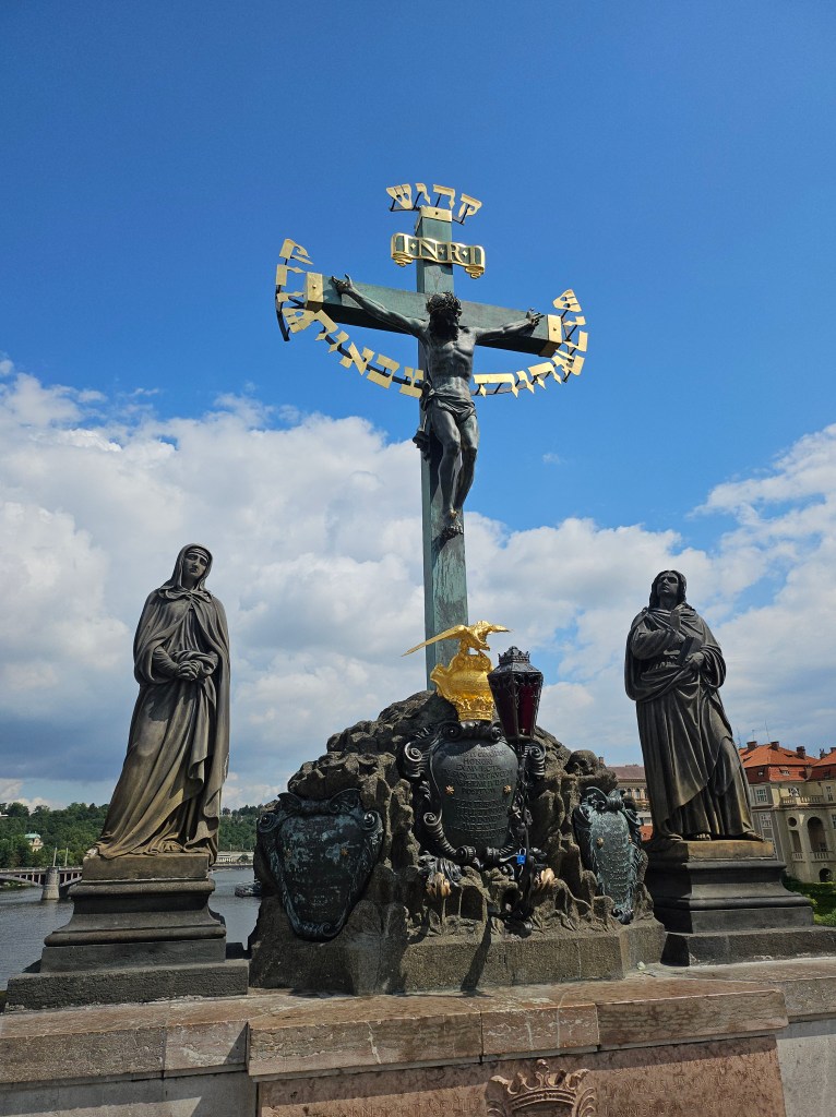 Stolpersteine can be found in many of the cities that boast a vanished Jewish population. What cannot always be found is visible and unapologetic reminders of their humiliation. Walking the Charles Bridge on the afternoon of the first day of the conference, I was stopped in my tracks by a statue of Jesus on the cross (the statue’s formal name is The Calvary), surrounded by one of the holiest lines in Jewish liturgy in four-inch-high gold letters: Holy, holy, holy is the Lord of Hosts, complete with the four-letter name for God, shimmering in the sunlight. I had a sinking feeling that I knew what had happened, but I looked it up anyway to confirm. In 1696, a Jewish blacksmith had been accused of debasing the cross, and the city had forced him to raise the money for the gold to place around Christ’s head, a permanently visible symbol of Jewish humiliation for the city. A rabbi had asked the city to at least add a plaque explaining its presence in the early 2000s. The plaque – which is in Czech, English, and Hebrew – does not offer an apology, only an explanation of how it came to be. We are not the only ones who struggle with the central problem related to removing offensive statues: apathy, a sense that we have already done enough, and the feeling that there is no one left alive to care.