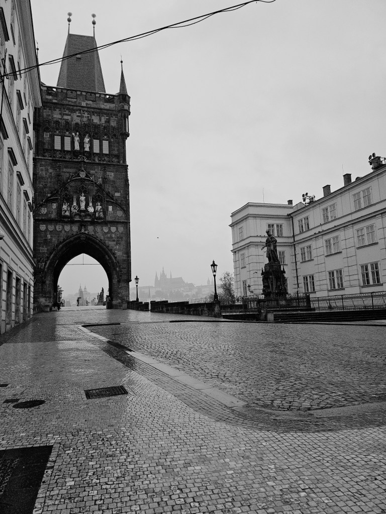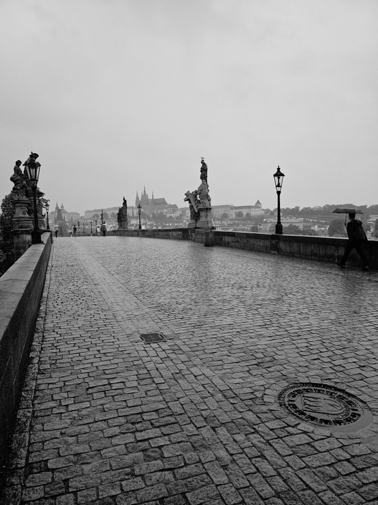 The conference did not give me time to visit the city’s many art museums or the Czech National Museum, but I like to think that that leaves me a to-do list for a future trip. There was one place, however, that I wanted to see properly, gold-haloed Christ and all. The Charles Bridge is absolutely mobbed every day with tourists; you cannot hope for a respite even late at night. So two days before my departure, I took a friend’s advice (thank you, Kathy!) and went to see the bridge at 5am instead, where the early hour and the rain of the morning kept nearly everyone away. Without people, the city seems to revert to its oldest self, a place suspended in time. I watched a few people hurry by under their umbrellas and thought of all the others who must have done the same since the bridge began construction in 1357 and wondered if they felt the same sense of awe that I did. Much has changed, of course, even here: the Germans and the Jews have vanished, a light rail and subway system service the whole city, even at 5am, there were one or two people out wielding selfie sticks. But the city feels trapped in amber all the same, as if it is a place where the past and the present can still exist alongside each other.