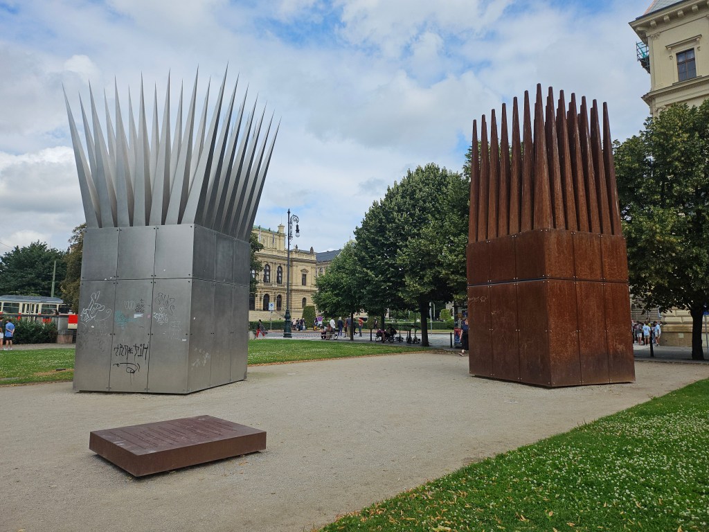 Although Soviet architecture never permeated the city, there are plenty of memorials to remind denizens of life under communism. Many honor the students who stood up in protest: a memorial to the protests of 1948 praises students for remaining true to their beliefs. By Charles University’s Faculty of Arts and Sciences Building, a two-part memorial honors one of the students who self-immolated in 1969 in protest of the violent shutdown of the Prague Spring. A silver array of spikes honors him, while a rusting array of spikes honors his grieving mother. He remains ablaze; she is left behind with the ruins. Elsewhere in the city, the Memorial to the Victims of Communism shows pieces of the human form slowly making their way down a flight of stairs, struggling to become whole. This memorial to the victims of communism dedicated to all victims, reads its inscription, not only those who were jailed or executed but also those whose lives were ruined by totalitarian despotism.